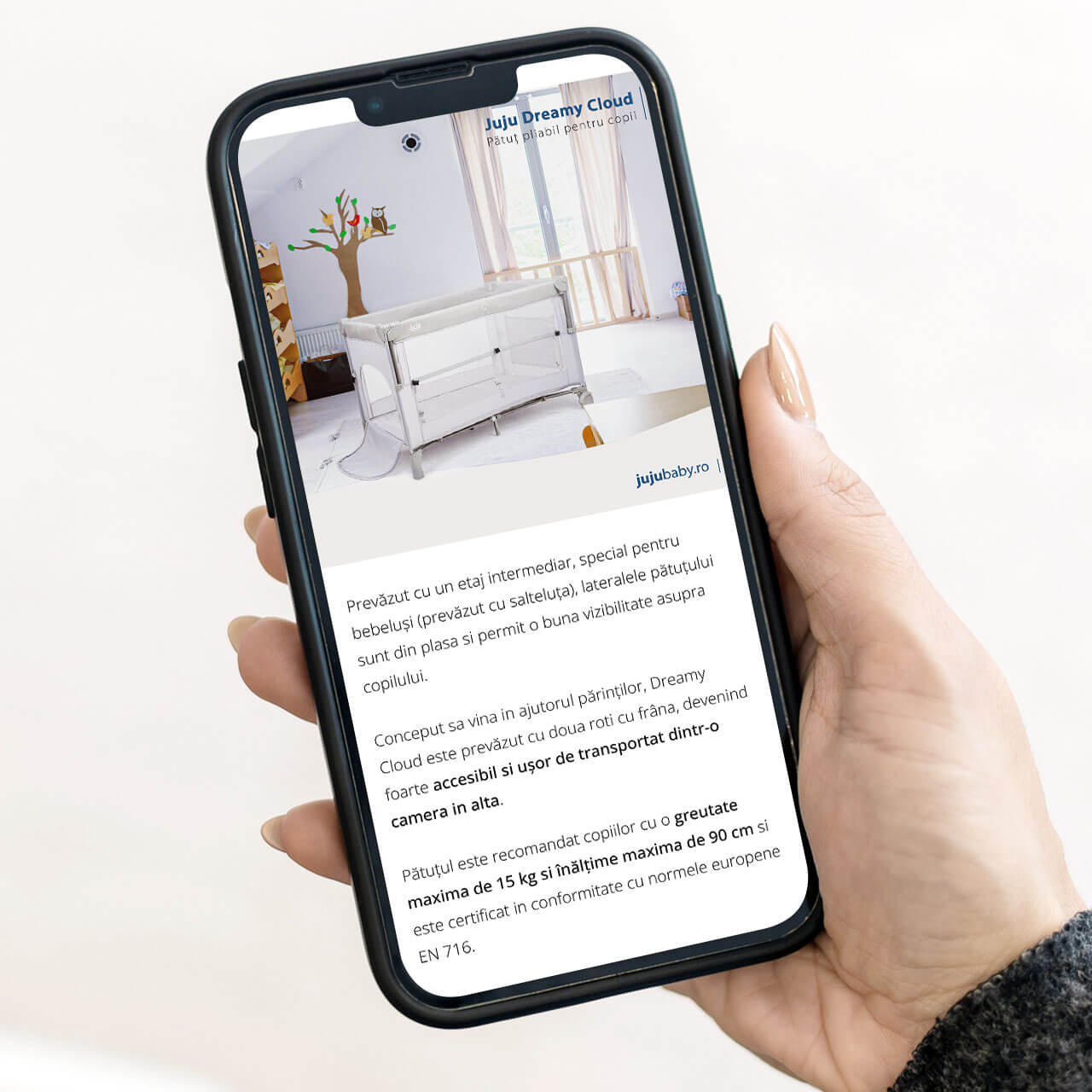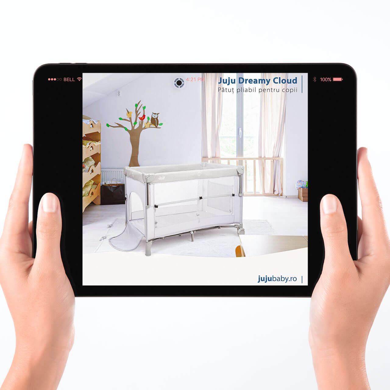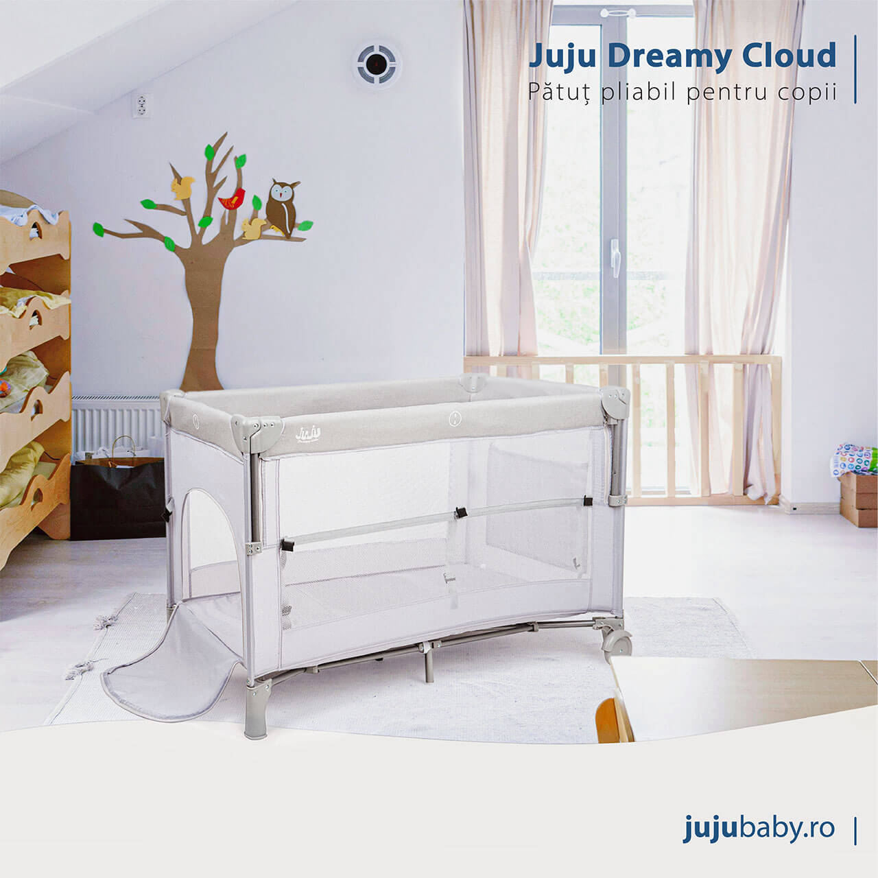 However, the final graphic elements, such as the curved bottom banner and textual overlays (“Juju Dreamy Cloud – Pătuț pliabil pentru copii”), were designed and added in Adobe Illustrator.
