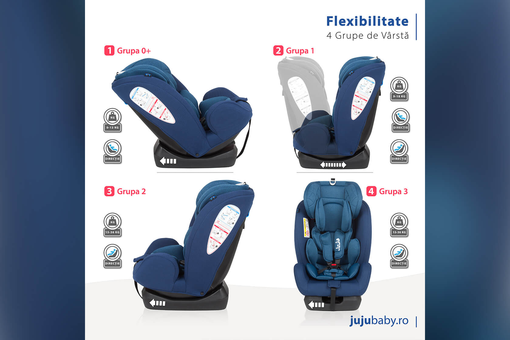 This visual was created to highlight the flexibility of the Juju Gladiator car seat, which adapts to four different age and weight groups.
